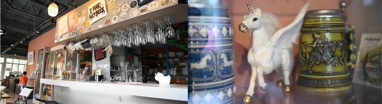 Upon opening the front door, visitors will be greeted by a vibrant atmosphere enhanced by a mix of elegant and industrial-style décor. The store’s red brick walls are lined with rows of books, and the bookstore’s resident unicorn awaits mid-prance upon a wall painting, ready to carry new riders to new literary heights.